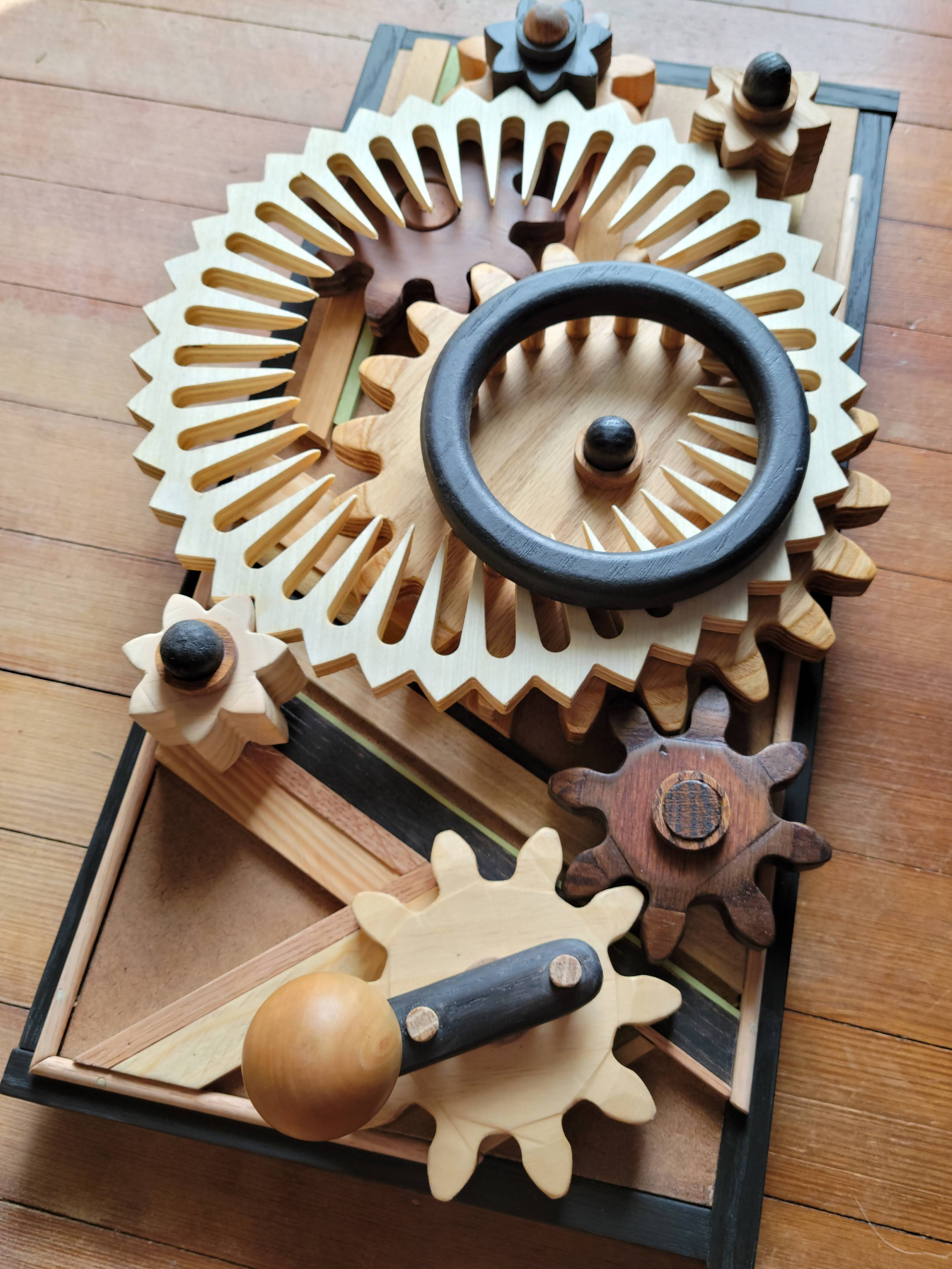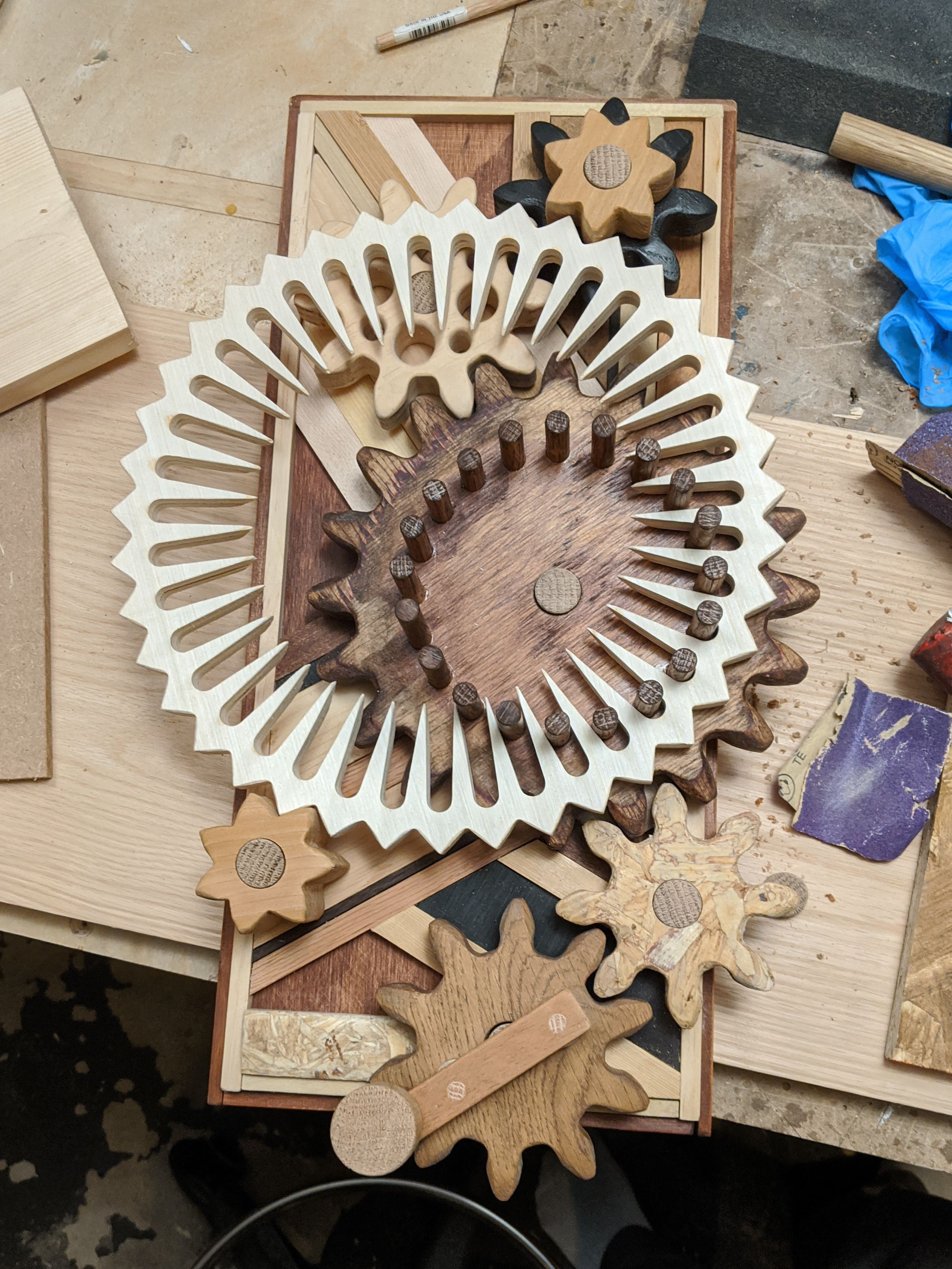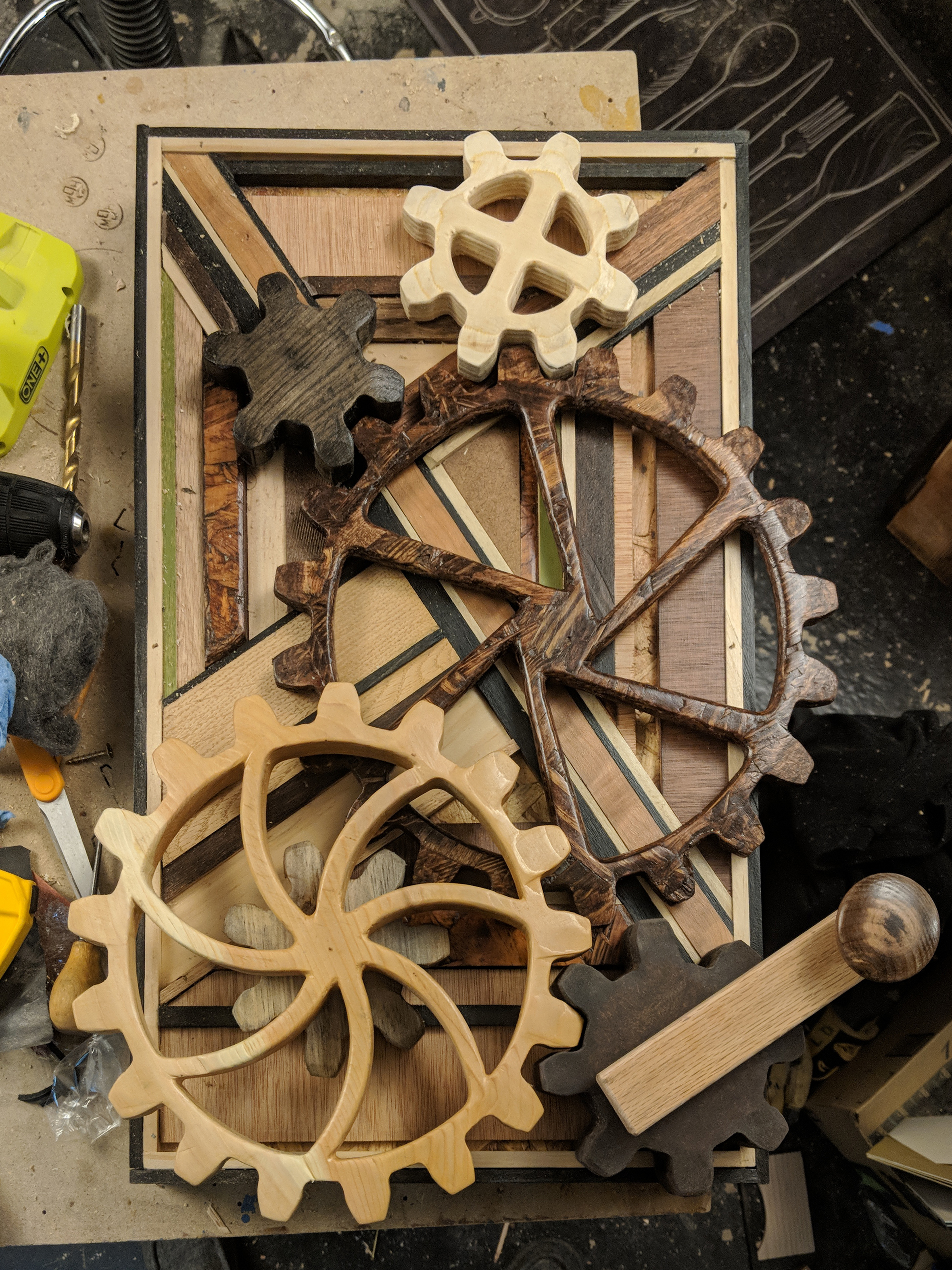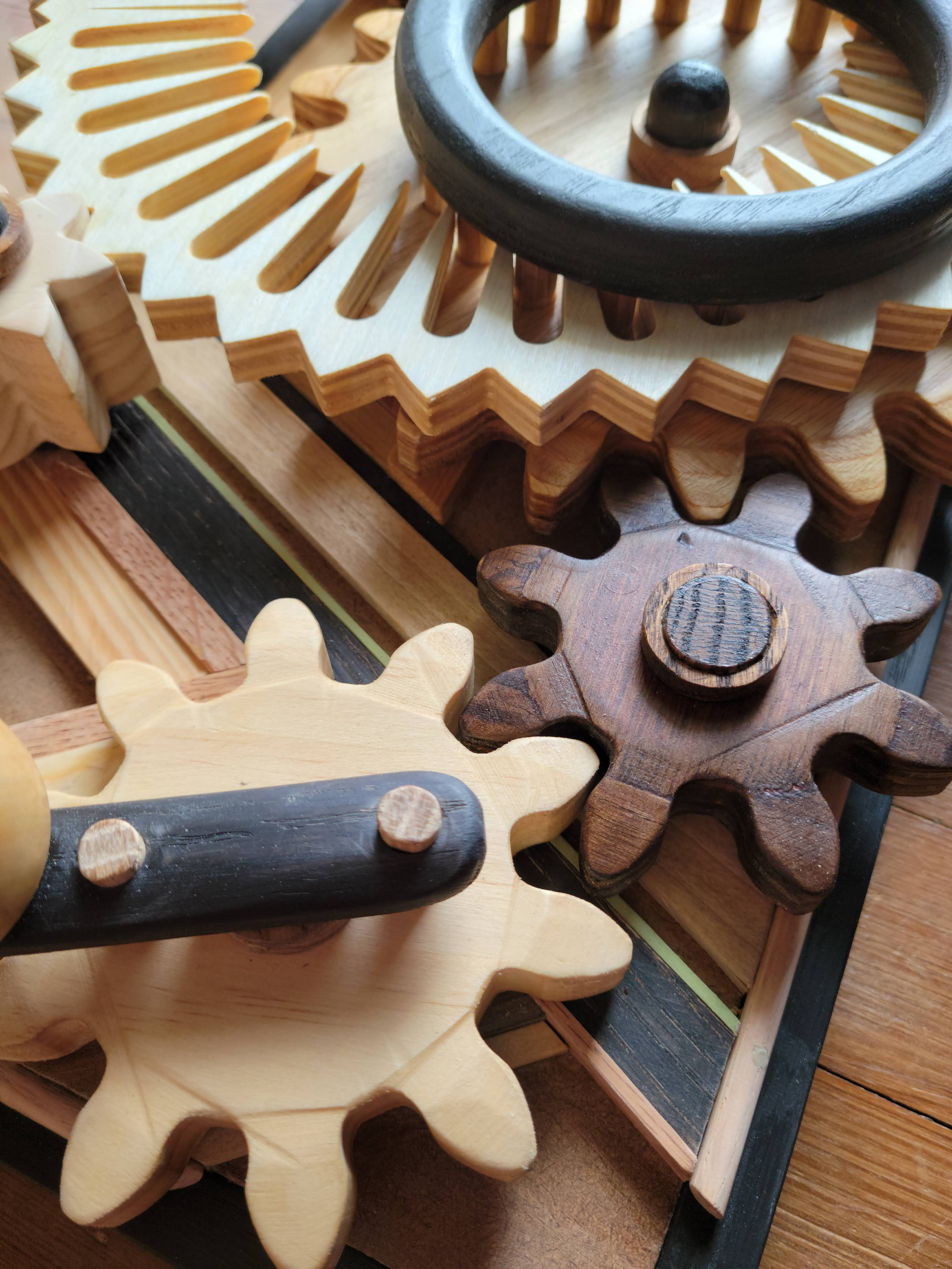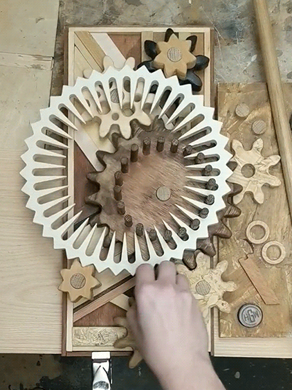 following a natural infatuation for gears, and inspired by such artists as David C Roy and woodworkers like Ronald Walter and Matthias Wandel, i created a series of kinectic sculptures featuring wooden spur and lantern gears.