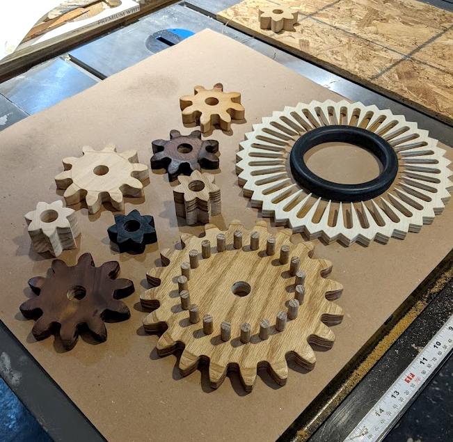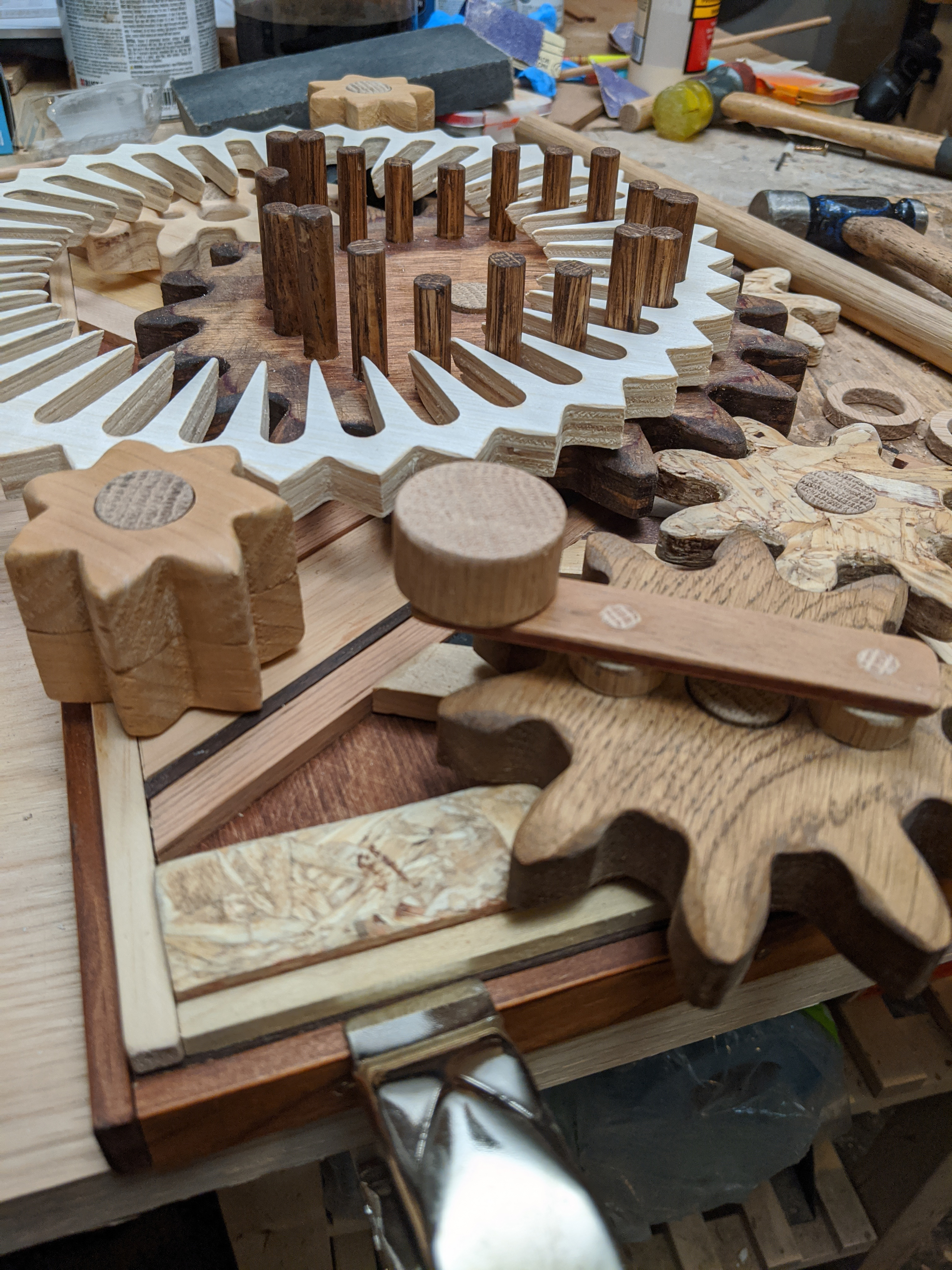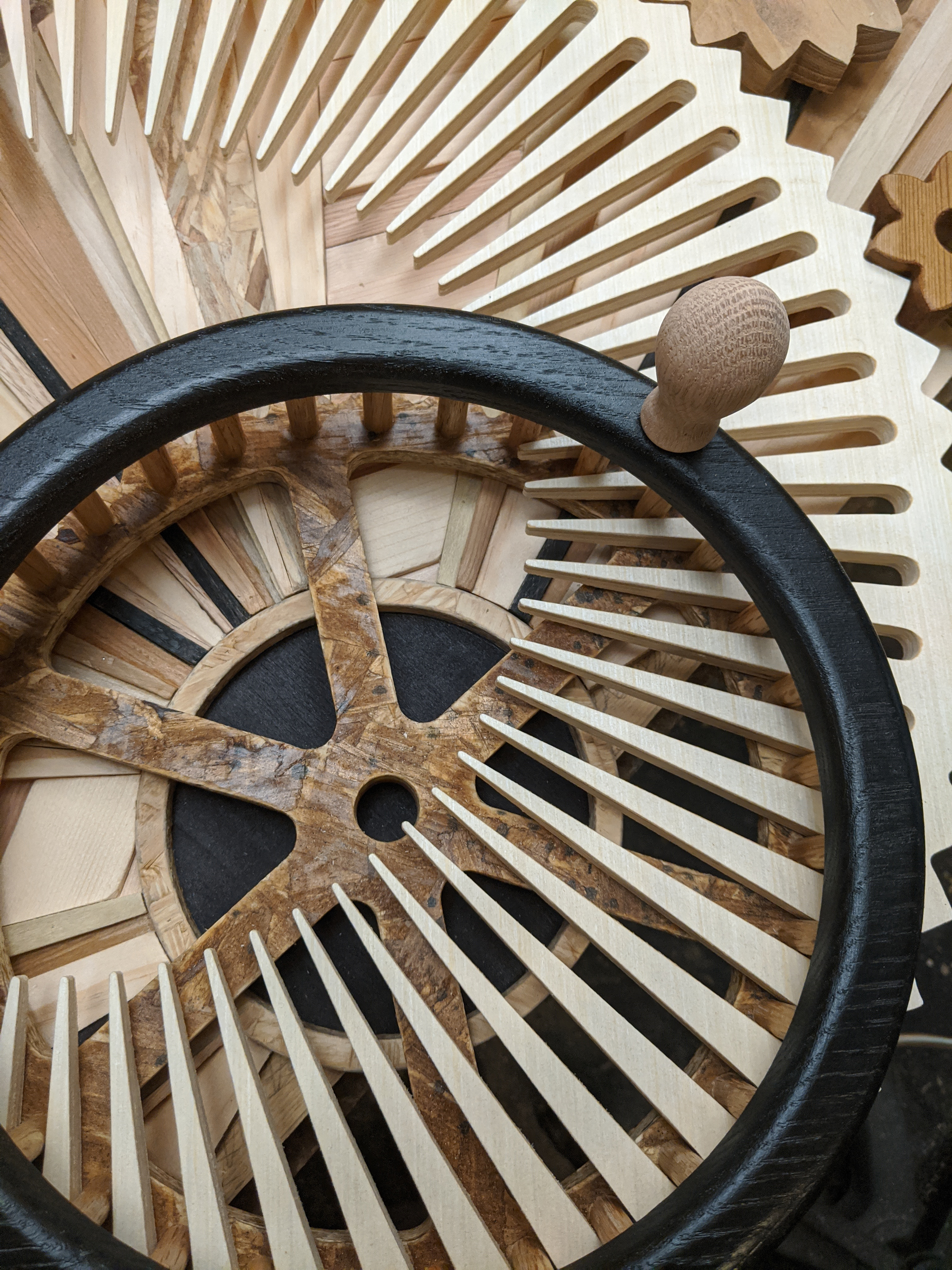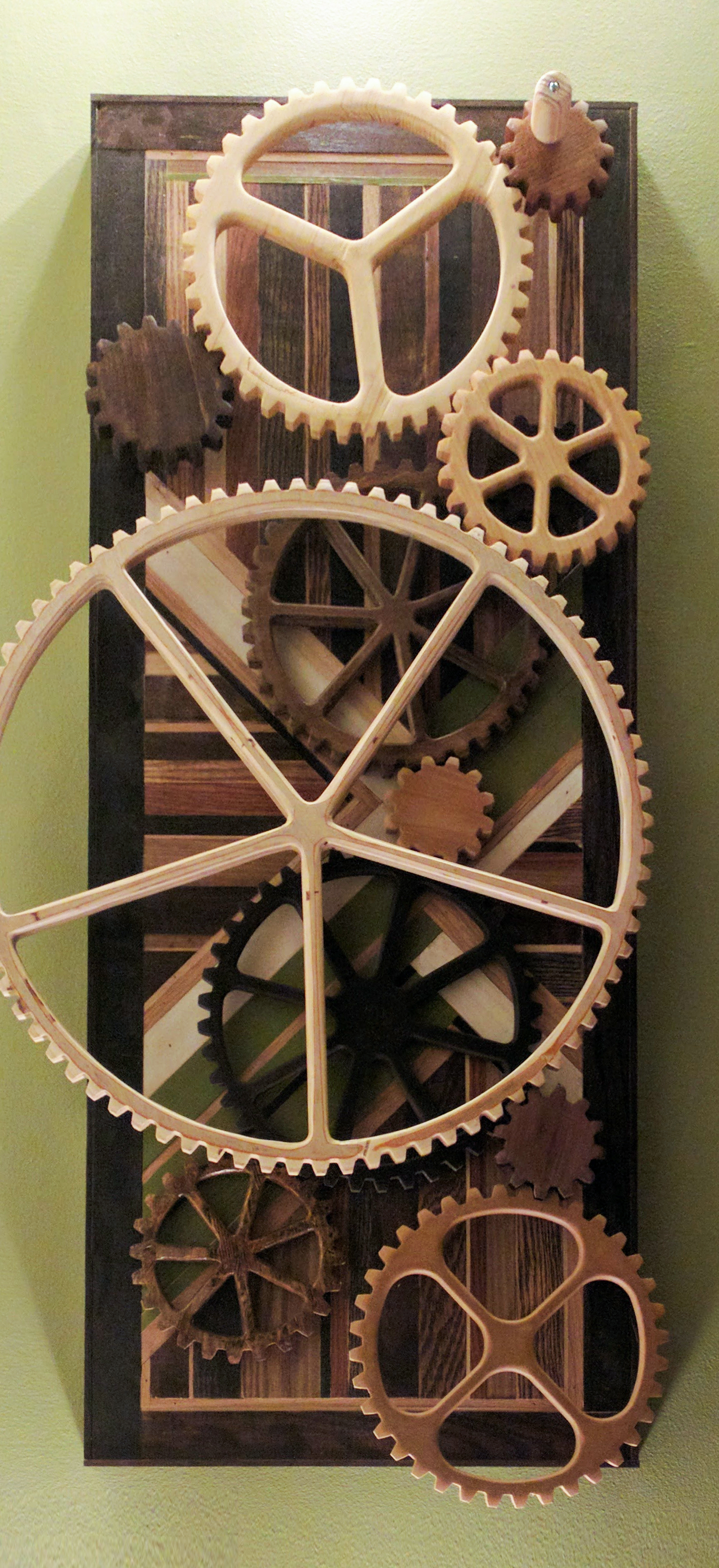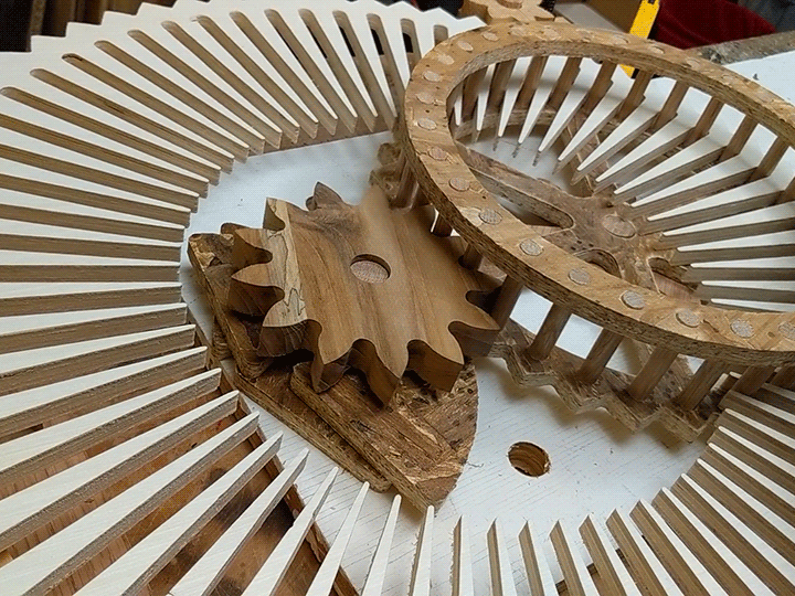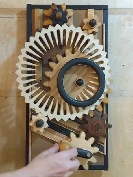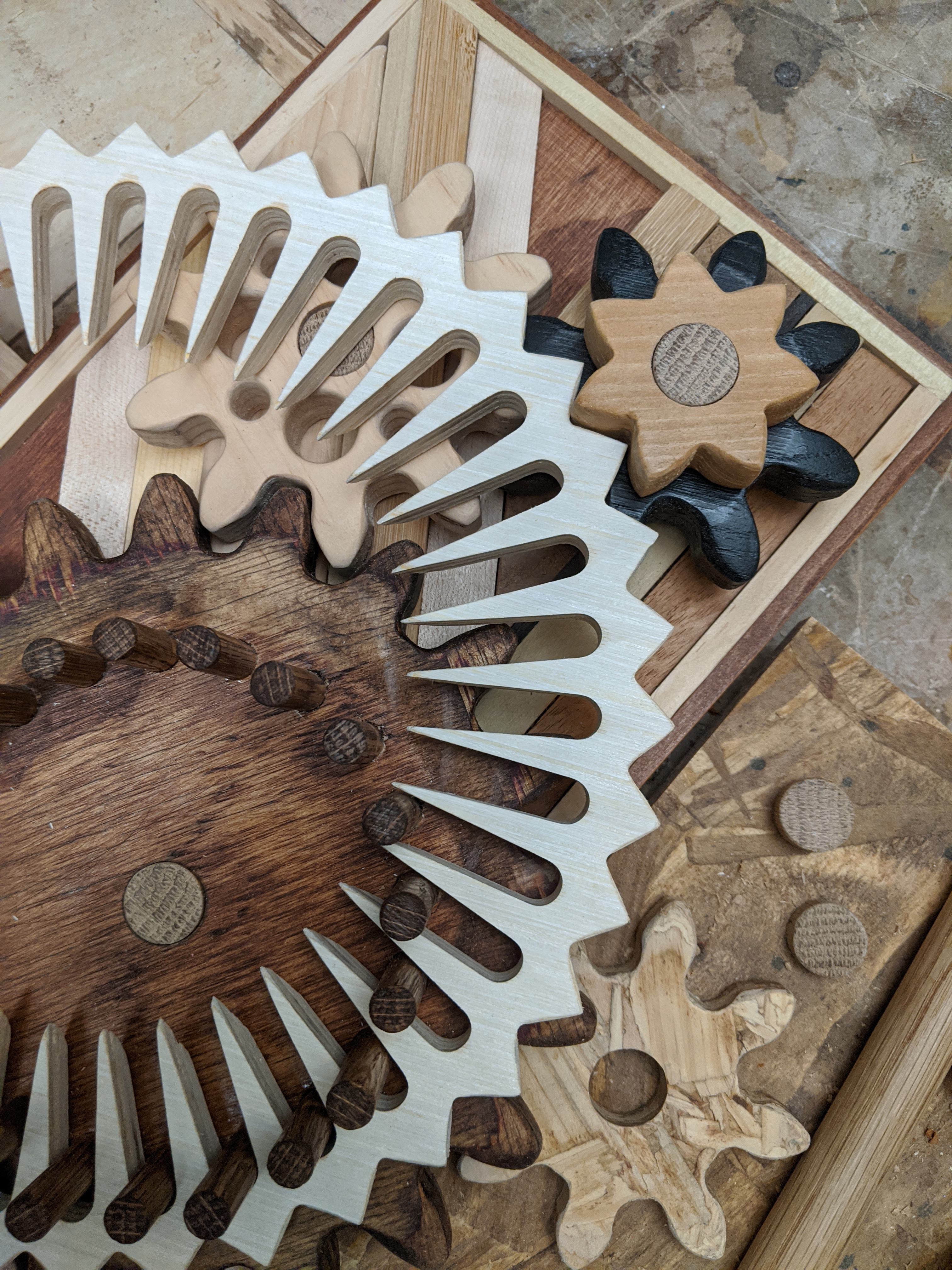 following a natural infatuation for gears, and inspired by such artists as David C Roy and woodworkers like Ronald Walter and Matthias Wandel, i created a series of kinectic sculptures featuring wooden spur and lantern gears.