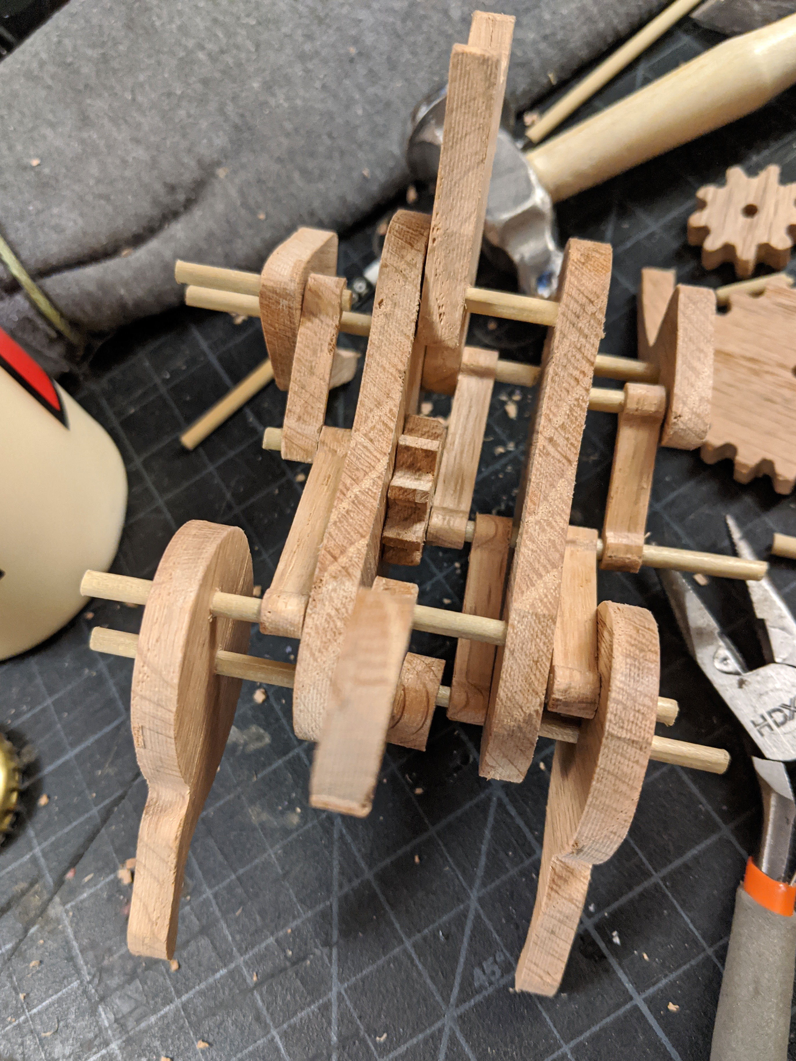 working with large open gearing was an exercise in balance and form, letting the mechanism be the subject. however decreasing the size to a small internal space, and use the gearing to drive movement in a subject proved to be a dog of a different color. after many design iteration, it ended up as a fitting piece for our perfectly sized pup.