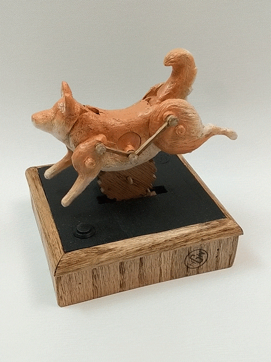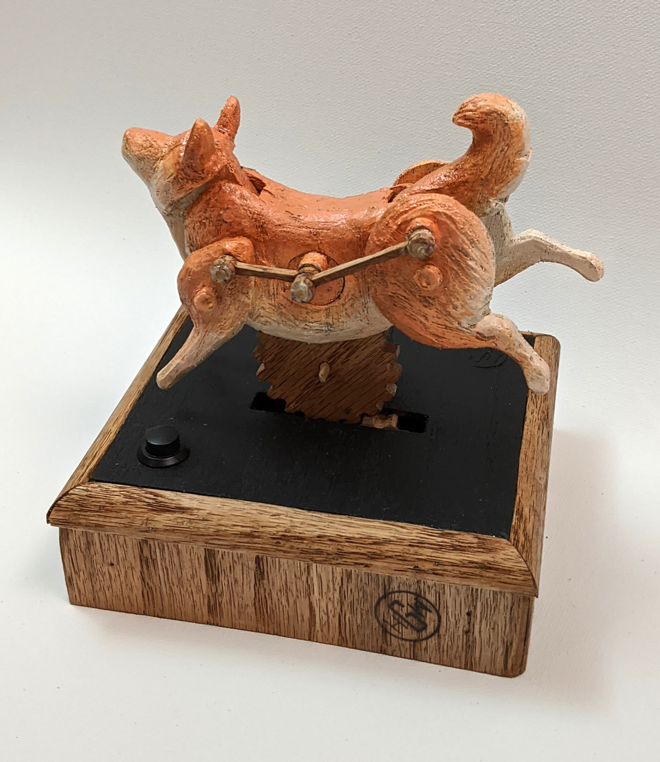 after several successes with geared kinectics with the machines, and ever seeking to challenge myself, i embarked (!) on my first automaton sculpture, and could think of no fitting subject than our spunky and energenic shiba inu.